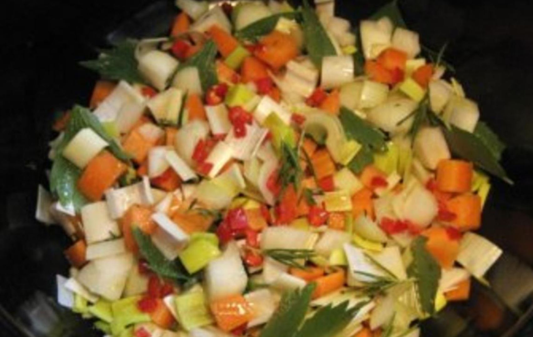 - Karotte, Lauch und Zwiebeln in grobe Stücke schneiden, die Kräuter von den Stielen zupfen und die Hälfte von Allem in den Bräter geben. Chilischote fein würfeln und auf die Gemüse und Kräuter im Bräter verteilen (notfalls eine gute Prise trockene Chiliflocken nehmen).